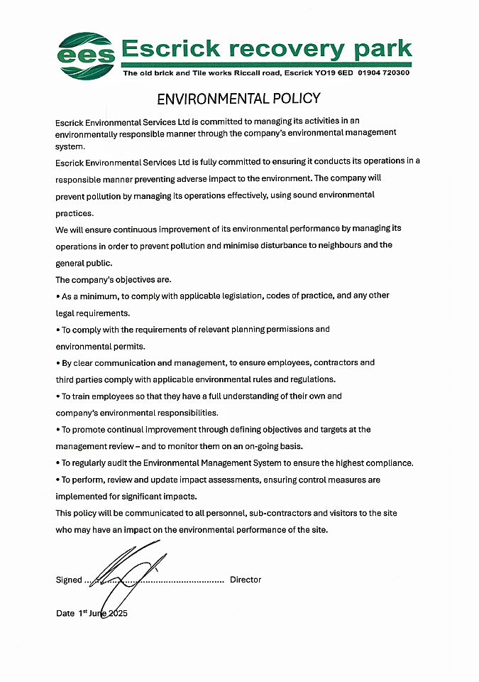Escrick Recovery Park is committed to managing its activities in an environmentally responsible manner. Our site Environmental Management System helps to identify and minimise the risk of pollution.